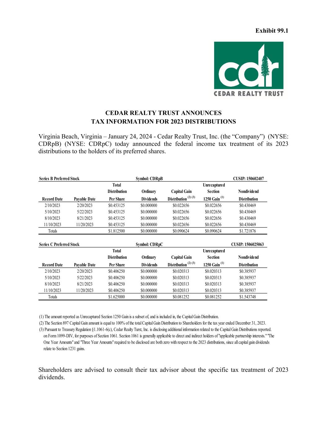 Exhibit 99.1 CEDAR REALTY TRUST ANNOUNCES TAX INFORMATION FOR 2023 DISTRIBUTIONS Virginia Beach, Virginia – January 24, 2024 - Cedar Realty Trust, Inc. (the “Company”) (NYSE: CDRpB) (NYSE: CDRpC) today announced the federal income tax treatment of its 2023 distributions to the holders of its preferred shares. Total Unrecaptured Distribution Ordinary Capital Gain Section Nondividend Record Date Payable Date Per Share Dividends Distribution (2) (3) 1250 Gain (1) Distribution 2/10/2023 2/20/2023 $0.453125 $0.000000 $0.022656 $0.022656 $0.430469 5/10/2023 5/22/2023 $0.453125 $0.000000 $0.022656 $0.022656 $0.430469 8/10/2023 8/21/2023 $0.453125 $0.000000 $0.022656 $0.022656 $0.430469 11/10/2023 11/20/2023 $0.453125 $0.000000 $0.022656 $0.022656 $0.430469 Totals $1.812500 $0.000000 $0.090624 $0.090624 $1.721876 Total Unrecaptured Distribution Ordinary Capital Gain Section Nondividend Record Date Payable Date Per Share Dividends Distribution (2) (3) 1250 Gain (1) Distribution 2/10/2023 2/20/2023 $0.406250 $0.000000 $0.020313 $0.020313 $0.385937 5/10/2023 5/22/2023 $0.406250 $0.000000 $0.020313 $0.020313 $0.385937 8/10/2023 8/21/2023 $0.406250 $0.000000 $0.020313 $0.020313 $0.385937 11/10/2023 11/20/2023 $0.406250 $0.000000 $0.020313 $0.020313 $0.385937 Totals $1.625000 $0.000000 $0.081252 $0.081252 $1.543748 (1) The amount reported as Unrecaptured Section 1250 Gain is a subset of, and is included in, the Capital Gain Distribution. (2) The Section 897 Capital Gain amount is equal to 100% of the total Capital Gain Distribution to Shareholders for the tax year ended December 31, 2023. (3) Pursuant to Treasury Regulation §1.1061-6(c), Cedar Realty Turst, Inc. is disclosing additional information related to the Capital Gain Distributions reported. on Form 1099-DIV, for purposes of Section 1061. Section 1061 is generally applicable to direct and indirect holders of "applicable partnership interests." "The One Year Amounts" and "Three Year Amounts" required to be disclosed are both zero with respect to the 2023 distributions, since all capital gain dividends relate to Section 1231 gains. CUSIP: 1506025063 Series B Preferred Stock Series C Preferred Stock Symbol: CDRpB Symbol: CDRpC CUSIP: 150602407 Shareholders are advised to consult their tax advisor about the specific tax treatment of 2023 dividends.