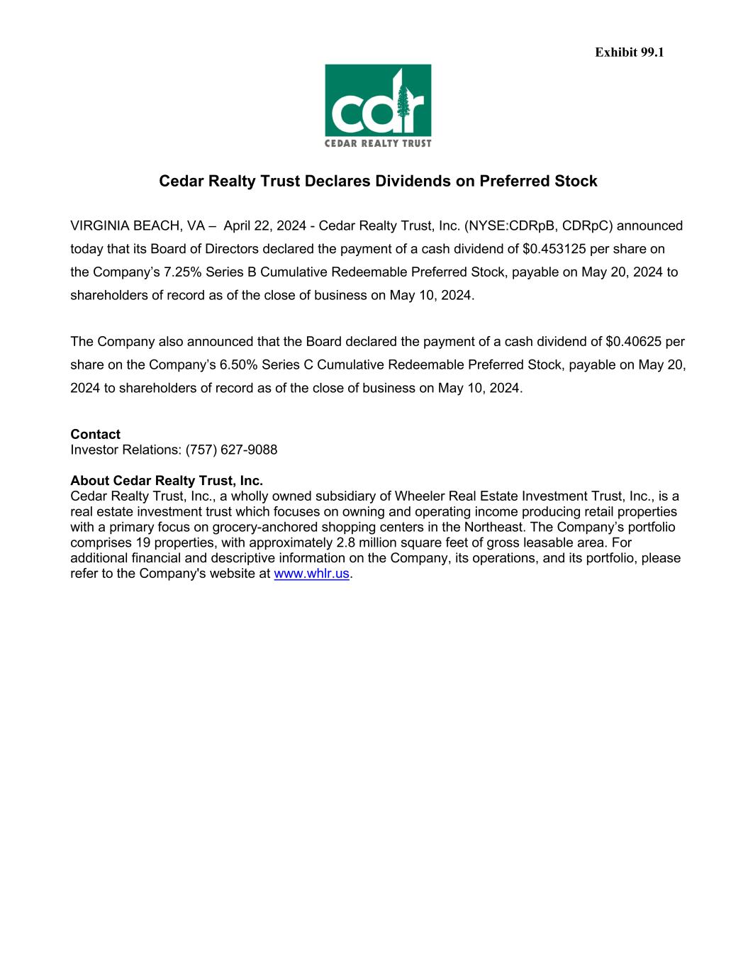 Exhibit 99.1 Cedar Realty Trust Declares Dividends on Preferred Stock VIRGINIA BEACH, VA – April 22, 2024 - Cedar Realty Trust, Inc. (NYSE:CDRpB, CDRpC) announced today that its Board of Directors declared the payment of a cash dividend of $0.453125 per share on the Company’s 7.25% Series B Cumulative Redeemable Preferred Stock, payable on May 20, 2024 to shareholders of record as of the close of business on May 10, 2024. The Company also announced that the Board declared the payment of a cash dividend of $0.40625 per share on the Company’s 6.50% Series C Cumulative Redeemable Preferred Stock, payable on May 20, 2024 to shareholders of record as of the close of business on May 10, 2024. Contact Investor Relations: (757) 627-9088 About Cedar Realty Trust, Inc. Cedar Realty Trust, Inc., a wholly owned subsidiary of Wheeler Real Estate Investment Trust, Inc., is a real estate investment trust which focuses on owning and operating income producing retail properties with a primary focus on grocery-anchored shopping centers in the Northeast. The Company’s portfolio comprises 19 properties, with approximately 2.8 million square feet of gross leasable area. For additional financial and descriptive information on the Company, its operations, and its portfolio, please refer to the Company's website at www.whlr.us.