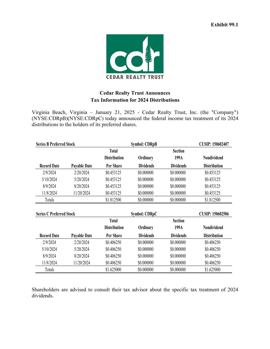 Exhibit 99.1 Cedar Realty Trust Announces Tax Information for 2024 Distributions Virginia Beach, Virginia – January 21, 2025 - Cedar Realty Trust, Inc. (the "Company") (NYSE:CDRpB)(NYSE:CDRpC) today announced the federal income tax treatment of its 2024 distributions to the holders of its preferred shares. Total Section Distribution Ordinary 199A Nondividend Record Date Payable Date Per Share Dividends Dividends Distribution 2/9/2024 2/20/2024 $0.453125 $0.000000 $0.000000 $0.453125 5/10/2024 5/20/2024 $0.453125 $0.000000 $0.000000 $0.453125 8/9/2024 8/20/2024 $0.453125 $0.000000 $0.000000 $0.453125 11/8/2024 11/20/2024 $0.453125 $0.000000 $0.000000 $0.453125 Totals $1.812500 $0.000000 $0.000000 $1.812500 Total Section Distribution Ordinary 199A Nondividend Record Date Payable Date Per Share Dividends Dividends Distribution 2/9/2024 2/20/2024 $0.406250 $0.000000 $0.000000 $0.406250 5/10/2024 5/20/2024 $0.406250 $0.000000 $0.000000 $0.406250 8/9/2024 8/20/2024 $0.406250 $0.000000 $0.000000 $0.406250 11/8/2024 11/20/2024 $0.406250 $0.000000 $0.000000 $0.406250 Totals $1.625000 $0.000000 $0.000000 $1.625000 CUSIP: 150602506 Series B Preferred Stock Series C Preferred Stock Symbol: CDRpB Symbol: CDRpC CUSIP: 150602407 Shareholders are advised to consult their tax advisor about the specific tax treatment of 2024 dividends.