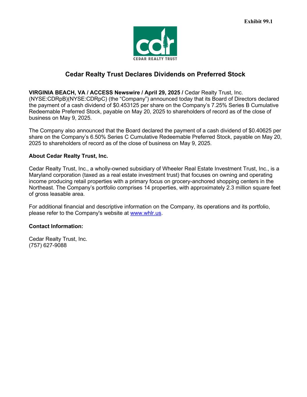 Exhibit 99.1 Cedar Realty Trust Declares Dividends on Preferred Stock VIRGINIA BEACH, VA / ACCESS Newswire / April 29, 2025 / Cedar Realty Trust, Inc. (NYSE:CDRpB)(NYSE:CDRpC) (the “Company”) announced today that its Board of Directors declared the payment of a cash dividend of $0.453125 per share on the Company’s 7.25% Series B Cumulative Redeemable Preferred Stock, payable on May 20, 2025 to shareholders of record as of the close of business on May 9, 2025. The Company also announced that the Board declared the payment of a cash dividend of $0.40625 per share on the Company’s 6.50% Series C Cumulative Redeemable Preferred Stock, payable on May 20, 2025 to shareholders of record as of the close of business on May 9, 2025. About Cedar Realty Trust, Inc. Cedar Realty Trust, Inc., a wholly-owned subsidiary of Wheeler Real Estate Investment Trust, Inc., is a Maryland corporation (taxed as a real estate investment trust) that focuses on owning and operating income producing retail properties with a primary focus on grocery-anchored shopping centers in the Northeast. The Company’s portfolio comprises 14 properties, with approximately 2.3 million square feet of gross leasable area. For additional financial and descriptive information on the Company, its operations and its portfolio, please refer to the Company's website at www.whlr.us. Contact Information: Cedar Realty Trust, Inc. (757) 627-9088