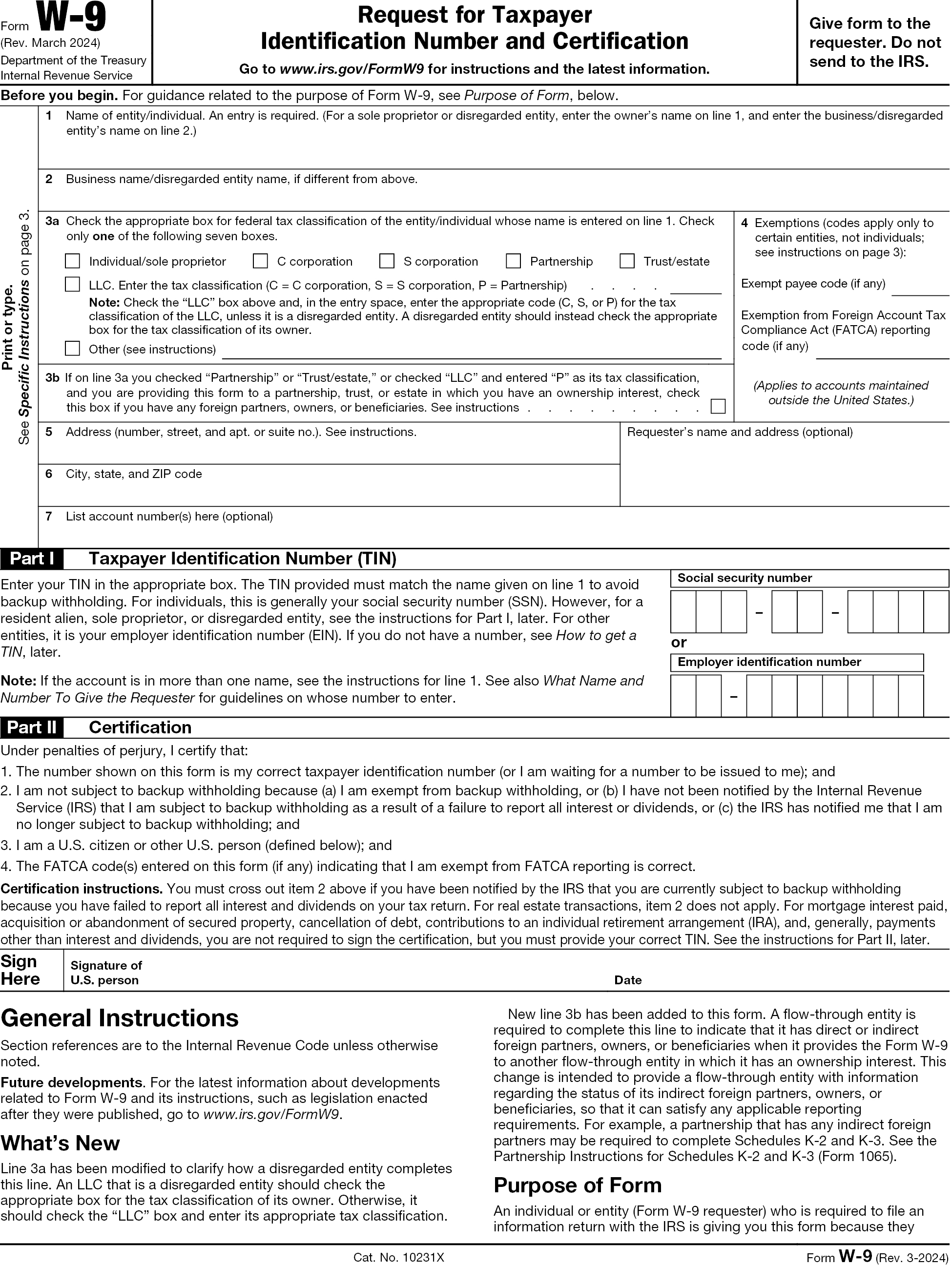 Form W-9 Rev. March 2024) Department of the Treasury Internal Revenue Service Request for Taxpayer Identification Number and Certification Department of the Treasury Internal Revenue Service Go to www.irs.gov/FormW9 for instructions and the latest information. Give form to the requester. Do not send to the IRS. Before you begin. For guidance related to the purpose of Form W-9, see Purpose of Form, below. Print or type. See Specific Instructions on page 3. 1 Name of entity/individual. An entry is required. (For a sole proprietor or disregarded entity, enter the owner’s name on line 1, and enter the business/disregarded entity’s name on line 2.) 2 Business name/disregarded entity name, if different from above. 3a Check the appropriate box for federal tax classification of the entity/individual whose name is entered on line 1. Check only one of the following seven boxes. Individual/sole proprietor C corporation S corporation Partnership Trust/estate LLC. Enter the tax classification (C = C corporation, S = S corporation, P = Partnership) . . . . Note: Check the “LLC” box above and, in the entry space, enter the appropriate code (C, S, or P) for the tax classification of the LLC, unless it is a disregarded entity. A disregarded entity should instead check the appropriate box for the tax classification of its owner. Other (see instructions) 3b If on line 3a you checked “Partnership” or “Trust/estate,” or checked “LLC” and entered “P” as its tax classification, and you are providing this form to a partnership, trust, or estate in which you have an ownership interest, check this box if you have any foreign partners, owners, or beneficiaries. See instructions . . . . . . . . . 4 Exemptions (codes apply only to certain entities, not individuals; see instructions on page 3): Exempt payee code (if any) Exemption from Foreign Account Tax Compliance Act (FATCA) reporting code (if any) (Applies to accounts maintained outside the United States.) 5 Address (number, street, and apt. or suite no.). See instructions. 6 City, state, and ZIP code Requester’s name and address (optional) 7 List account number(s) here (optional) Part I Taxpayer Identification Number (TIN) Enter your TIN in the appropriate box. The TIN provided must match the name given on line 1 to avoid backup withholding. For individuals, this is generally your social security number (SSN). However, for a resident alien, sole proprietor, or disregarded entity, see the instructions for Part I, later. For other entities, it is your employer identification number (EIN). If you do not have a number, see How to get a TIN, later. Note: If the account is in more than one name, see the instructions for line 1. See also What Name and Number To Give the Requester for guidelines on whose number to enter. Social security number – – or Employer identification number Part II Certification Under penalties of perjury, I certify that: 1. The number shown on this form is my correct taxpayer identification number (or I am waiting for a number to be issued to me); and 2. I am not subject to backup withholding because (a) I am exempt from backup withholding, or (b) I have not been notified by the Internal Revenue Service (IRS) that I am subject to backup withholding as a result of a failure to report all interest or dividends, or (c) the IRS has notified me that I am no longer subject to backup withholding; and 3. I am a U.S. citizen or other U.S. person (defined below); and 4. The FATCA code(s) entered on this form (if any) indicating that I am exempt from FATCA reporting is correct. Certification instructions. You must cross out item 2 above if you have been notified by the IRS that you are currently subject to backup withholding because you have failed to report all interest and dividends on your tax return. For real estate transactions, item 2 does not apply. For mortgage interest paid, acquisition or abandonment of secured property, cancellation of debt, contributions to an individual retirement arrangement (IRA), and, generally, payments other than interest and dividends, you are not required to sign the certification, but you must provide your correct TIN. See the instructions for Part II, later. Sign Here Signature of U.S. person Date General Instructions Section references are to the Internal Revenue Code unless otherwise noted. Future developments. For the latest information about developments related to Form W-9 and its instructions, such as legislation enacted after they were published, go to www.irs.gov/FormW9. What’s New Line 3a has been modified to clarify how a disregarded entity completes this line. An LLC that is a disregarded entity should check the appropriate box for the tax classification of its owner. Otherwise, it should check the “LLC” box and enter its appropriate tax classification. New line 3b has been added to this form. A flow-through entity is required to complete this line to indicate that it has direct or indirect foreign partners, owners, or beneficiaries when it provides the Form W-9 to another flow-through entity in which it has an ownership interest. This change is intended to provide a flow-through entity with information regarding the status of its indirect foreign partners, owners, or beneficiaries, so that it can satisfy any applicable reporting requirements. For example, a partnership that has any indirect foreign partners may be required to complete Schedules K-2 and K-3. See the Partnership Instructions for Schedules K-2 and K-3 (Form 1065). Purpose of Form An individual or entity (Form W-9 requester) who is required to file an information return with the IRS is giving you this form because they