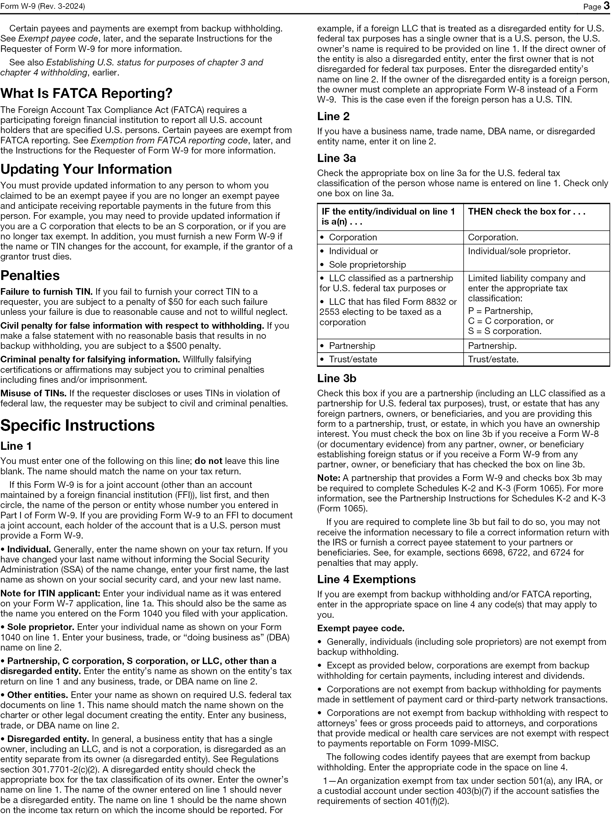 Certain payees and payments are exempt from backup withholding. See Exempt payee code, later, and the separate Instructions for the Requester of Form W-9 for more information. See also Establishing U.S. status for purposes of chapter 3 and chapter 4 withholding, earlier. What Is FATCA Reporting? The Foreign Account Tax Compliance Act (FATCA) requires a participating foreign financial institution to report all U.S. account holders that are specified U.S. persons. Certain payees are exempt from FATCA reporting. See Exemption from FATCA reporting code, later, and the Instructions for the Requester of Form W-9 for more information. Updating Your Information You must provide updated information to any person to whom you claimed to be an exempt payee if you are no longer an exempt payee and anticipate receiving reportable payments in the future from this person. For example, you may need to provide updated information if you are a C corporation that elects to be an S corporation, or if you are no longer tax exempt. In addition, you must furnish a new Form W-9 if the name or TIN changes for the account, for example, if the grantor of a grantor trust dies. Penalties Failure to furnish TIN. If you fail to furnish your correct TIN to a requester, you are subject to a penalty of $50 for each such failure unless your failure is due to reasonable cause and not to willful neglect. Civil penalty for false information with respect to withholding. If you make a false statement with no reasonable basis that results in no backup withholding, you are subject to a $500 penalty. Criminal penalty for falsifying information. Willfully falsifying certifications or affirmations may subject you to criminal penalties including fines and/or imprisonment. Misuse of TINs. If the requester discloses or uses TINs in violation of federal law, the requester may be subject to civil and criminal penalties. Specific Instructions Line 1 You must enter one of the following on this line; do not leave this line blank. The name should match the name on your tax return. If this Form W-9 is for a joint account (other than an account maintained by a foreign financial institution (FFI)), list first, and then circle, the name of the person or entity whose number you entered in Part I of Form W-9. If you are providing Form W-9 to an FFI to document a joint account, each holder of the account that is a U.S. person must provide a Form W-9. Individual. Generally, enter the name shown on your tax return. If you have changed your last name without informing the Social Security Administration (SSA) of the name change, enter your first name, the last name as shown on your social security card, and your new last name. Note for ITIN applicant: Enter your individual name as it was entered on your Form W-7 application, line 1a. This should also be the same as the name you entered on the Form 1040 you filed with your application. Sole proprietor. Enter your individual name as shown on your Form 1040 on line 1. Enter your business, trade, or “doing business as” (DBA) name on line 2. Partnership, C corporation, S corporation, or LLC, other than a disregarded entity. Enter the entity’s name as shown on the entity’s tax return on line 1 and any business, trade, or DBA name on line 2. Other entities. Enter your name as shown on required U.S. federal tax documents on line 1. This name should match the name shown on the charter or other legal document creating the entity. Enter any business, trade, or DBA name on line 2. Disregarded entity. In general, a business entity that has a single owner, including an LLC, and is not a corporation, is disregarded as an entity separate from its owner (a disregarded entity). See Regulations section 301.7701-2(c)(2). A disregarded entity should check the appropriate box for the tax classification of its owner. Enter the owner’s name on line 1. The name of the owner entered on line 1 should never be a disregarded entity. The name on line 1 should be the name shown on the income tax return on which the income should be reported. For example, if a foreign LLC that is treated as a disregarded entity for U.S. federal tax purposes has a single owner that is a U.S. person, the U.S. owner’s name is required to be provided on line 1. If the direct owner of the entity is also a disregarded entity, enter the first owner that is not disregarded for federal tax purposes. Enter the disregarded entity’s name on line 2. If the owner of the disregarded entity is a foreign person, the owner must complete an appropriate Form W-8 instead of a Form W-9. This is the case even if the foreign person has a U.S. TIN. Line 2 If you have a business name, trade name, DBA name, or disregarded entity name, enter it on line 2. Line 3a Check the appropriate box on line 3a for the U.S. federal tax classification of the person whose name is entered on line 1. Check only one box on line 3a. IF the entity/individual on line 1 is a(n) . . . THEN check the box for . . . Corporation Corporation. Individual or Sole proprietorship Individual/sole proprietor. LLC classified as a partnership for U.S. federal tax purposes or LLC that has filed Form 8832 or 2553 electing to be taxed as a corporation Limited liability company and enter the appropriate tax classification: P = Partnership, C = C corporation, or S = S corporation. Partnership Partnership. Trust/estate Trust/estate. Line 3b Check this box if you are a partnership (including an LLC classified as a partnership for U.S. federal tax purposes), trust, or estate that has any foreign partners, owners, or beneficiaries, and you are providing this form to a partnership, trust, or estate, in which you have an ownership interest. You must check the box on line 3b if you receive a Form W-8 (or documentary evidence) from any partner, owner, or beneficiary establishing foreign status or if you receive a Form W-9 from any partner, owner, or beneficiary that has checked the box on line 3b. Note: A partn