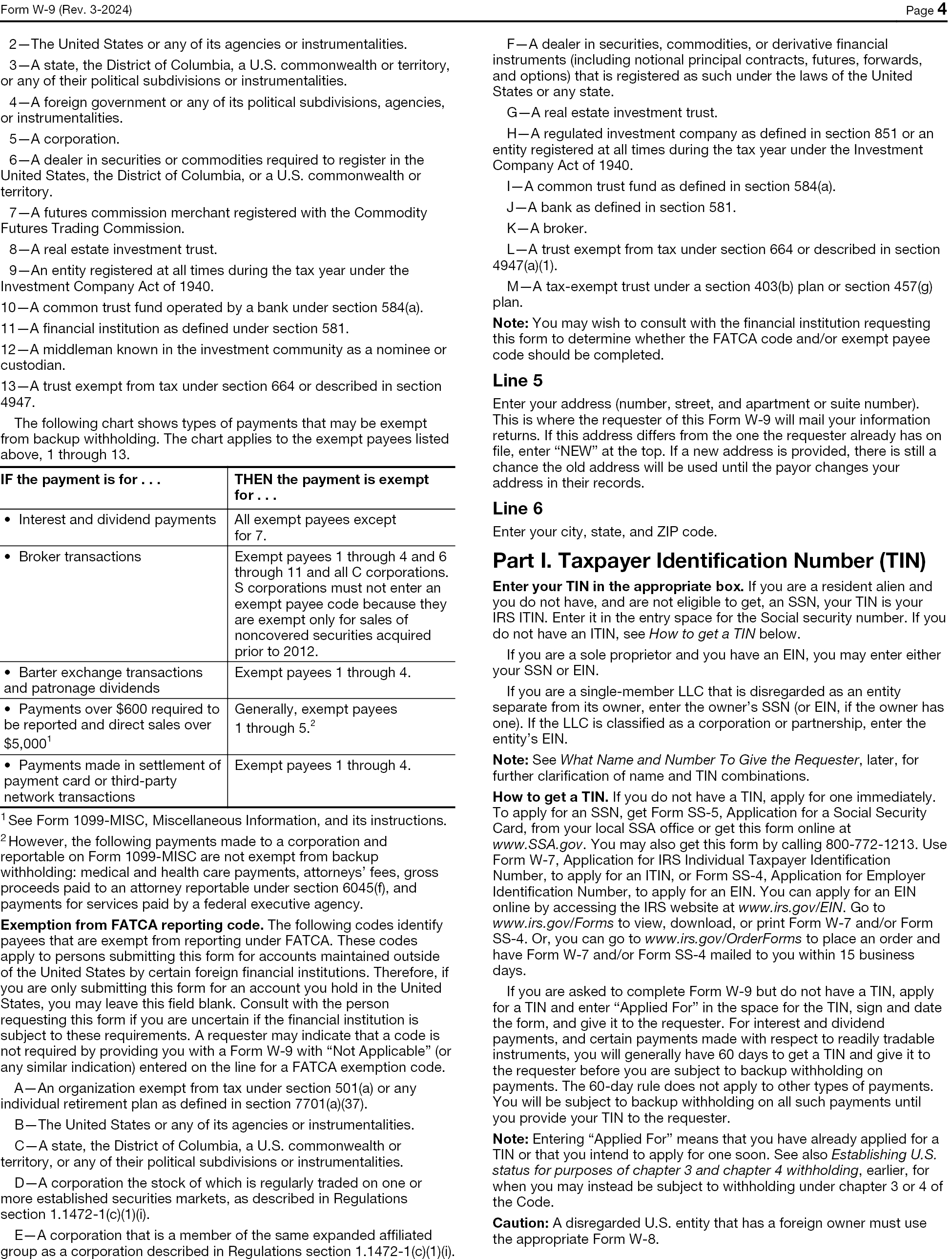 2—The United States or any of its agencies or instrumentalities. 3—A state, the District of Columbia, a U.S. commonwealth or territory, or any of their political subdivisions or instrumentalities. 4—A foreign government or any of its political subdivisions, agencies, or instrumentalities. 5—A corporation. 6—A dealer in securities or commodities required to register in the United States, the District of Columbia, or a U.S. commonwealth or territory. 7—A futures commission merchant registered with the Commodity Futures Trading Commission. 8—A real estate investment trust. 9—An entity registered at all times during the tax year under the Investment Company Act of 1940. 10—A common trust fund operated by a bank under section 584(a). 11—A financial institution as defined under section 581. 12—A middleman known in the investment community as a nominee or custodian. 13—A trust exempt from tax under section 664 or described in section 4947. The following chart shows types of payments that may be exempt from backup withholding. The chart applies to the exempt payees listed above, 1 through 13. IF the payment is for . . . THEN the payment is exempt for . . . Interest and dividend payments All exempt payees except for 7. Broker transactions Exempt payees 1 through 4 and 6 through 11 and all C corporations. S corporations must not enter an exempt payee code because they are exempt only for sales of noncovered securities acquired prior to 2012. Barter exchange transactions and patronage dividends Exempt payees 1 through 4. Payments over $600 required to be reported and direct sales over $5,0001 Generally, exempt payees 1 through 5.2 Payments made in settlement of payment card or third-party network transactions Exempt payees 1 through 4. 1 See Form 1099-MISC, Miscellaneous Information, and its instructions. 2 However, the following payments made to a corporation and reportable on Form 1099-MISC are not exempt from backup withholding: medical and health care payments, attorneys’ fees, gross proceeds paid to an attorney reportable under section 6045(f), and payments for services paid by a federal executive agency. Exemption from FATCA reporting code. The following codes identify payees that are exempt from reporting under FATCA. These codes apply to persons submitting this form for accounts maintained outside of the United States by certain foreign financial institutions. Therefore, if you are only submitting this form for an account you hold in the United States, you may leave this field blank. Consult with the person requesting this form if you are uncertain if the financial institution is subject to these requirements. A requester may indicate that a code is not required by providing you with a Form W-9 with “Not Applicable” (or any similar indication) entered on the line for a FATCA exemption code. A—An organization exempt from tax under section 501(a) or any individual retirement plan as defined in section 7701(a)(37). B—The United States or any of its agencies or instrumentalities. C—A state, the District of Columbia, a U.S. commonwealth or territory, or any of their political subdivisions or instrumentalities. D—A corporation the stock of which is regularly traded on one or more established securities markets, as described in Regulations section 1.1472-1(c)(1)(i). E—A corporation that is a member of the same expanded affiliated group as a corporation described in Regulations section 1.1472-1(c)(1)(i). F—A dealer in securities, commodities, or derivative financial instruments (including notional principal contracts, futures, forwards, and options) that is registered as such under the laws of the United States or any state. G—A real estate investment trust. H—A regulated investment company as defined in section 851 or an entity registered at all times during the tax year under the Investment Company Act of 1940. I—A common trust fund as defined in section 584(a). J—A bank as defined in section 581. K—A broker. L—A trust exempt from tax under section 664 or described in section 4947(a)(1). M—A tax-exempt trust under a section 403(b) plan or section 457(g) plan. Note: You may wish to consult with the financial institution requesting this form to determine whether the FATCA code and/or exempt payee code should be completed. Line 5 Enter your address (number, street, and apartment or suite number). This is where the requester of this Form W-9 will mail your information returns. If this address differs from the one the requester already has on file, enter “NEW” at the top. If a new address is provided, there is still a chance the old address will be used until the payor changes your address in their records. Line 6 Enter your city, state, and ZIP code. Part I. Taxpayer Identification Number (TIN) Enter your TIN in the appropriate box. If you are a resident alien and you do not have, and are not eligible to get, an SSN, your TIN is your IRS ITIN. Enter it in the entry space for the Social security number. If you do not have an ITIN, see How to get a TIN below. If you are a sole proprietor and you have an EIN, you may enter either your SSN or EIN. If you are a single-member LLC that is disregarded as an entity separate from its owner, enter the owner’s SSN (or EIN, if the owner has one). If the LLC is classified as a corporation or partnership, enter the entity’s EIN. Note: See What Name and Number To Give the Requester, later, for further clarification of name and TIN combinations. How to get a TIN. If you do not have a TIN, apply for one immediately. To apply for an SSN, get Form SS-5, Application for a Social Security Card, from your local SSA office or get this form online at www.SSA.gov. You may also get this form by calling 800-772-1213. Use Form W-7, Application for IRS Individual Taxpayer Identification Number, to apply for an ITIN, or Form SS-4, Application for Employer Identification Number, to apply for an EIN. You can apply for a